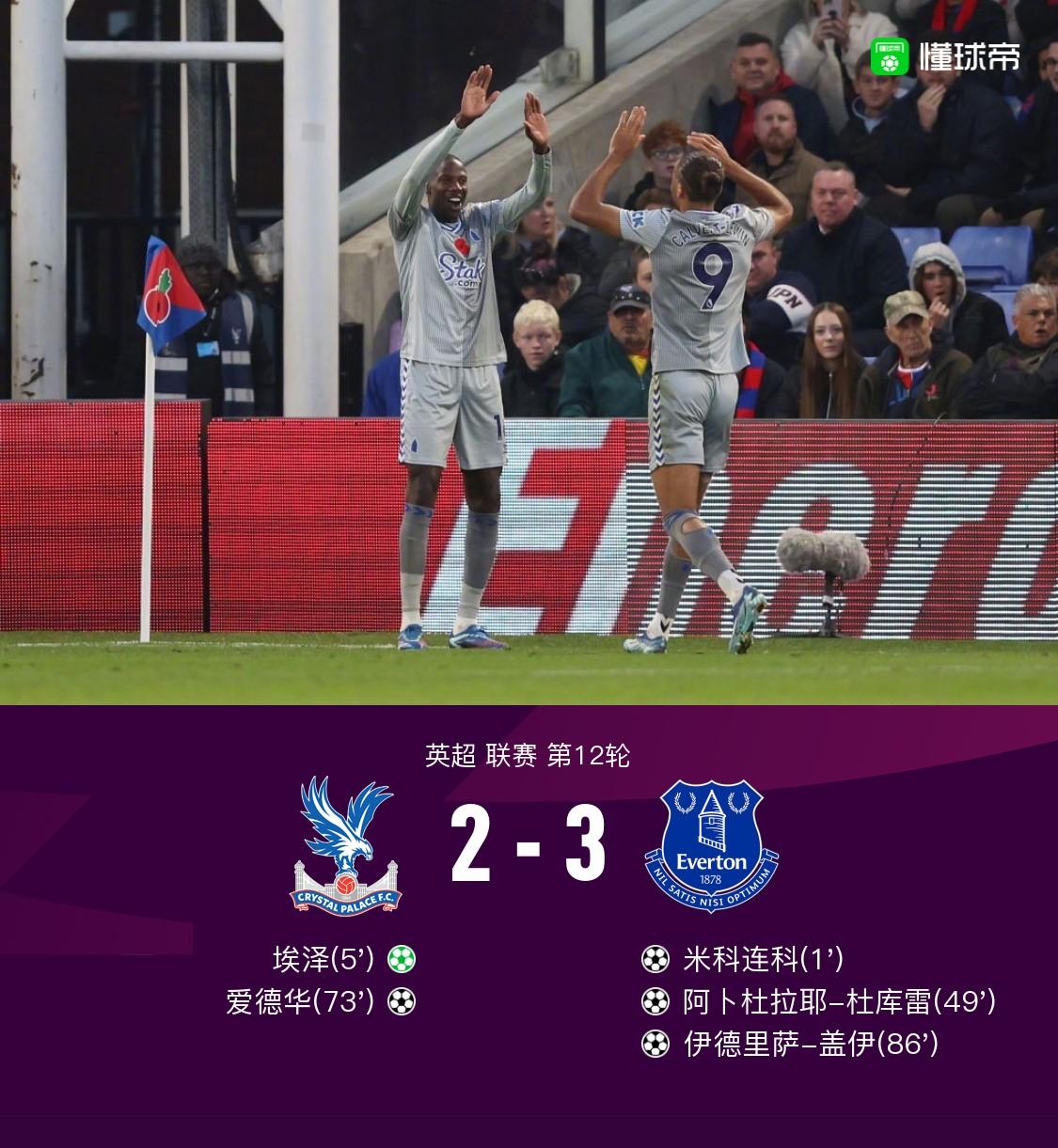 北京时间11月11日英超 联赛 第12轮,水晶宫主场对阵埃弗顿。上半场米科连科头球闪击,随后埃泽造点并亲自主罚主罚命中闪电扳平。下半场杜库雷补射破门再次领先,之后埃德华破门再次扳平,比赛尾声盖伊打进制胜球。最终埃弗顿3-2战胜水晶宫。