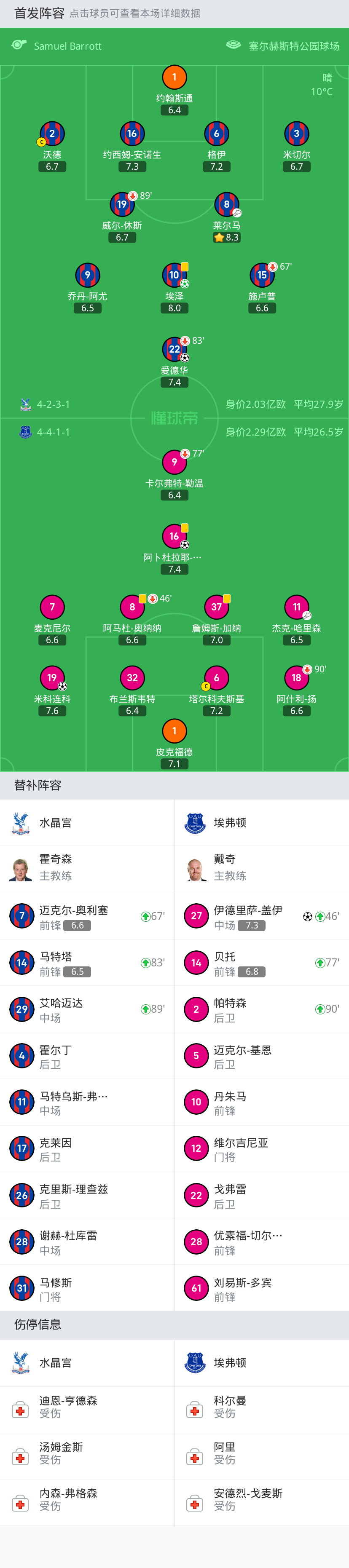 水晶宫 首发:17-克莱因, 15-施卢普, 1-约翰斯通, 19-威尔-休斯, 16-约西姆-安诺生, 8-莱尔马, 22-爱德华, 10-埃泽, 6-格伊, 26-克里斯-理查兹, 3-米切尔