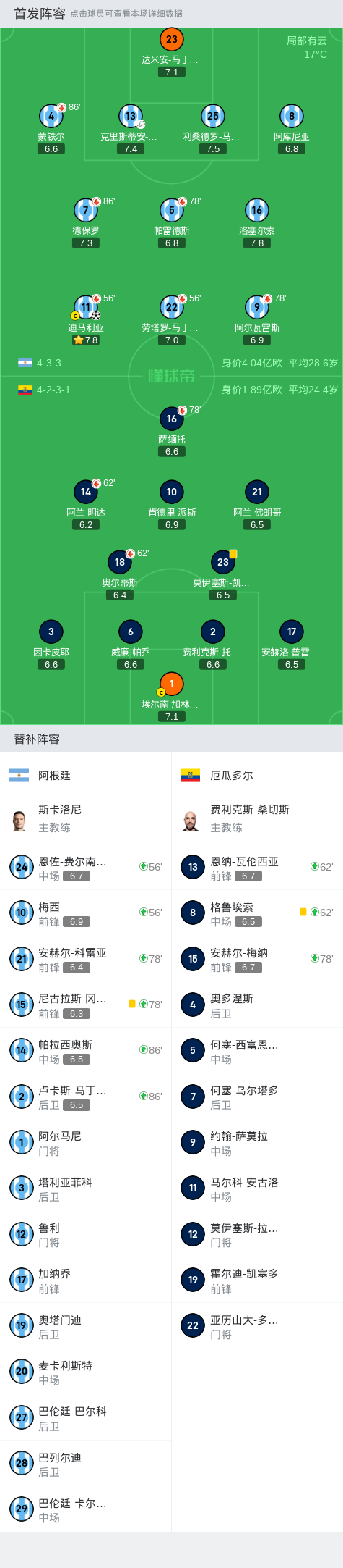 阿根廷替补:1-阿尔玛尼、12-鲁利、2-夸尔塔、4-蒙铁尔、6-佩泽拉、8-阿库尼亚、19-奥塔门迪、5-帕雷德斯、14-帕拉斯奥斯、16-洛塞尔索、18-圭多-罗德里格斯、9-阿尔瓦雷斯、11-迪马利亚、17-加纳乔、21-瓦伦丁-卡博尼