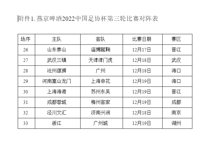 足协杯第3轮比赛,将在本月的17-19日进行,包括山东泰山vs淄博蹴鞠、沧州雄狮vs广州队、河南嵩山龙门vs上海申花、上海海港vs苏州东吴4场比赛,在晋江和海口两大赛区进行。