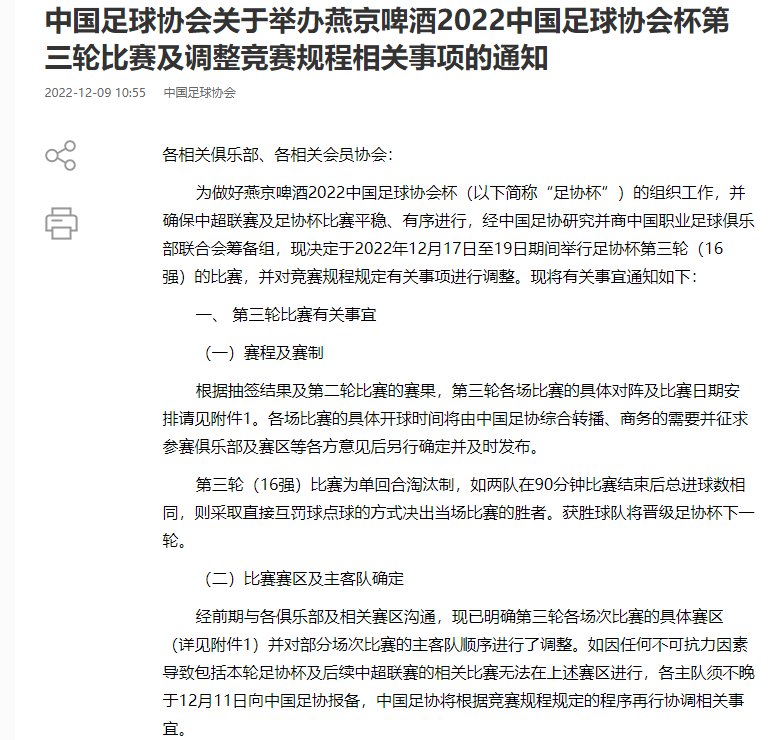 北京时间12月9日,中国足协官网公布了2022年度足协杯的剩余赛程,其中第3轮比赛(16强赛)12月17-19日进行,1/4决赛到决赛,拟定于明年的1月4日至15日在江苏省苏州市进行,原定半决赛的两回合赛事也更改为单场定胜负。