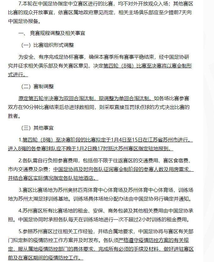 此外,原定半决赛的主客场赛制,改为单场定胜负,在赛区进行的足协杯赛事不对外开放,主客场比赛是否对观众开放,则要视情况而定。