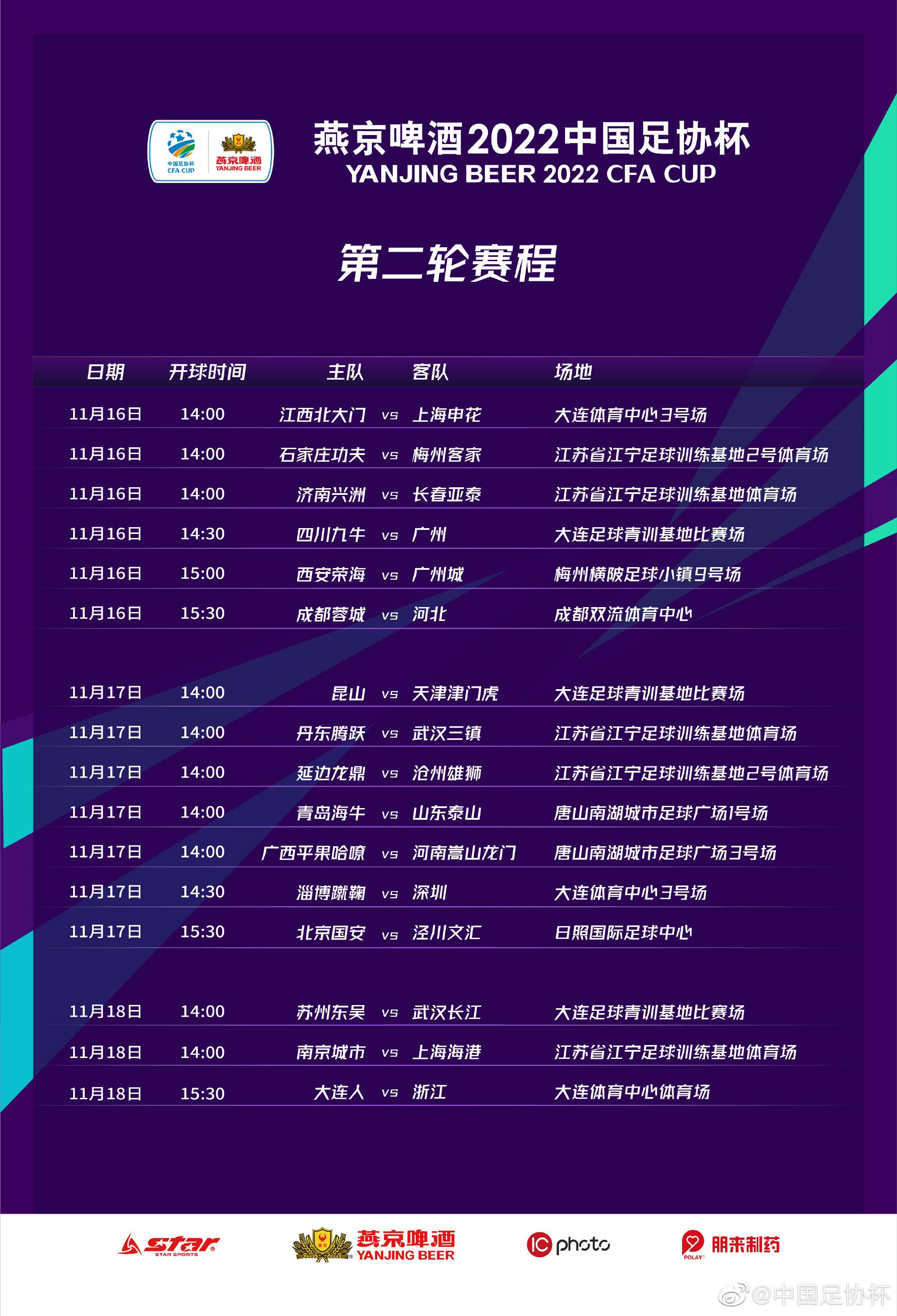 按照足协杯第二轮赛程,中乙冠军济南兴洲将于11月16日对阵长春亚泰,中乙亚军丹东腾跃、季军延边龙鼎将于11月17日分别对阵武汉三镇和沧州雄狮。