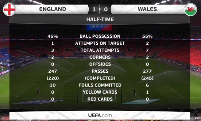 第45+3分钟,英格兰角球开出后,后点斯通斯头球形成吊门,被丹尼·沃德没收。第45+4分钟,威尔士队发出边线球后,乔·阿伦禁区前射门偏出。随着裁判一声哨响,双方暂时战成0:0。