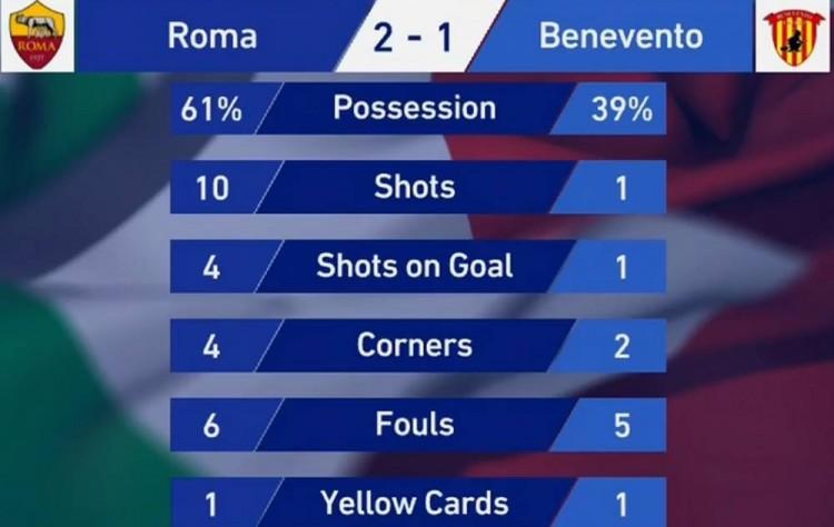 半场战罢,罗马暂2-1贝内文托。