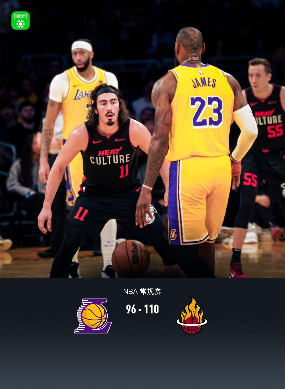 第四节湖人伍德拿下9分,热火邓肯-罗宾逊拿下11分,最终湖人96-110不敌热火