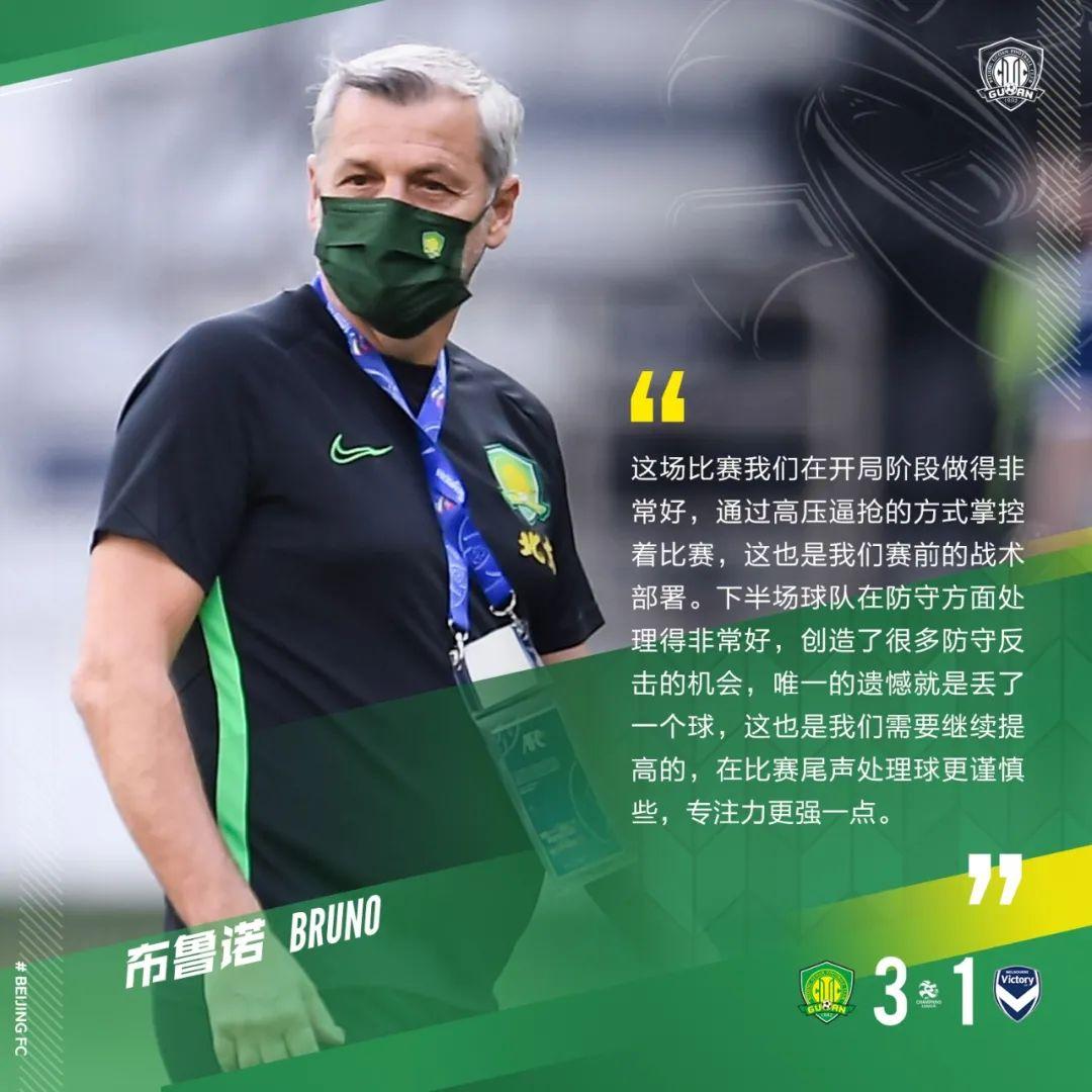 布鲁诺:这场比赛我们在开局阶段做得非常好,通过高压逼抢的方式掌控着比赛,这也是我们赛前的战术部署。下半场球队在防守方面处理得非常好,创造了很多防守反击的机会,唯一的遗憾就是丢了一个球,这也是我们需要继续提高的,在比赛尾声处理球更谨慎些,专注力更强一点。