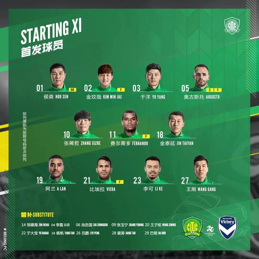 首发:1-侯森/18-金泰延(80'-李磊)、2-金玟哉、3-于洋、27-王刚/23-李可、10-张稀哲(68’-池忠国)、11-费尔南多(80’-吕鹏)、5-奥古斯托、21-比埃拉(68‘-巴顿)/19-阿兰(68'-王子铭)