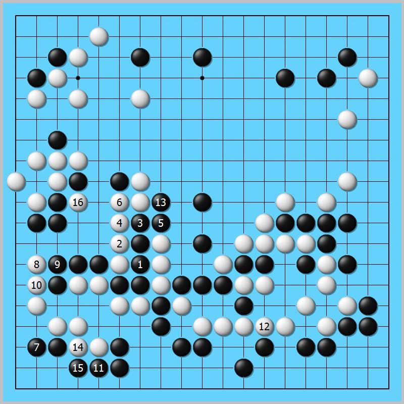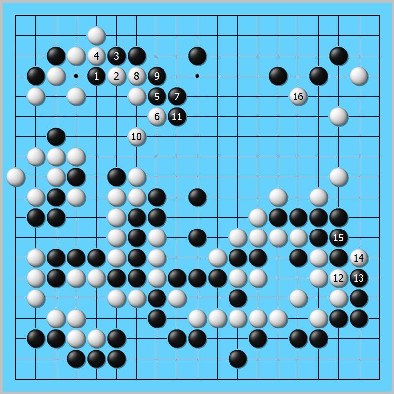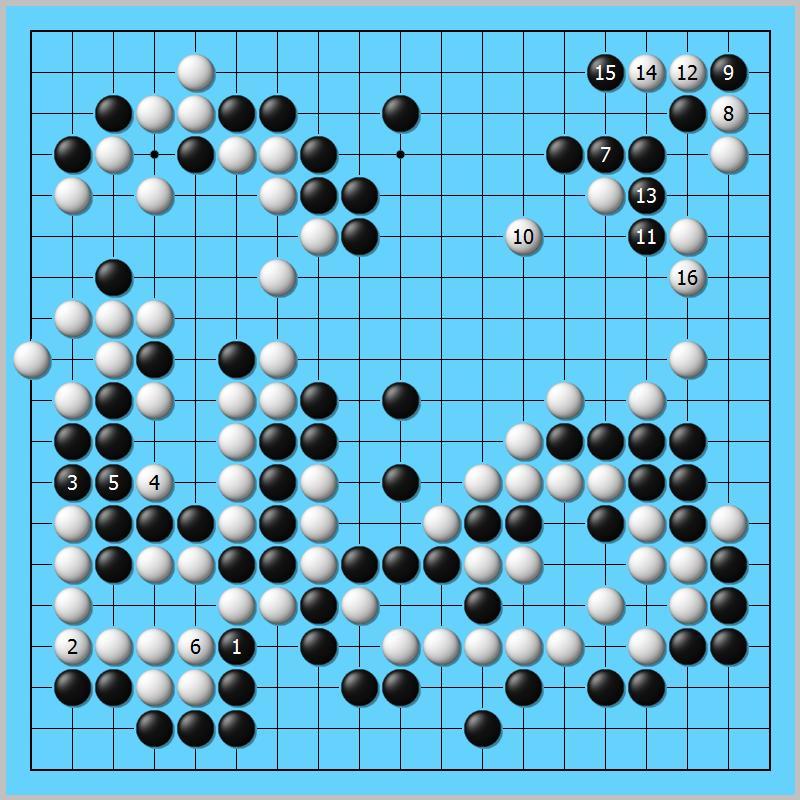 实战图七:激战过后,白棋形势不错,白16刺耗时41分钟,吴清源欲把优势尽快转化为胜势。