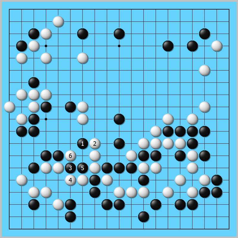 实战图五:黑棋1-5挑战,吴清源在胜负关键处总是很慎重的,他长考49分钟以后下出了白6断反击。双方都知道这里将决定胜负。