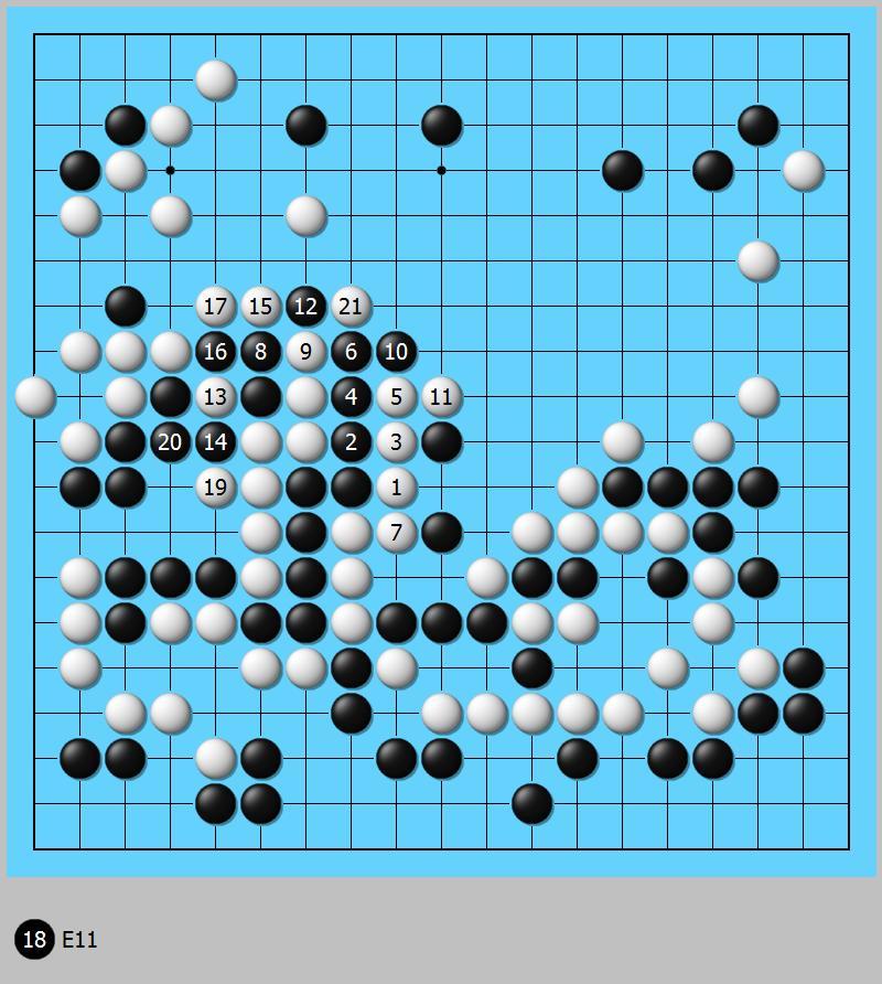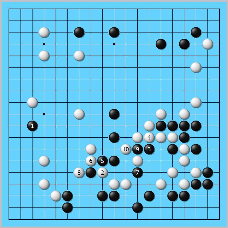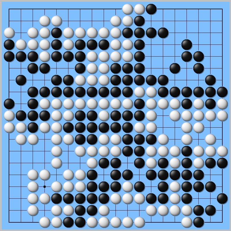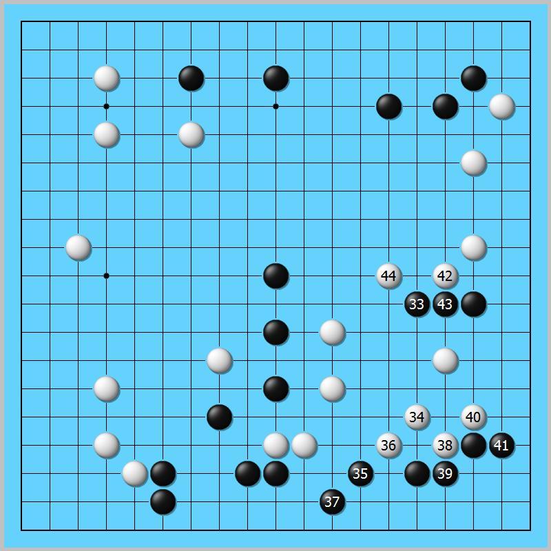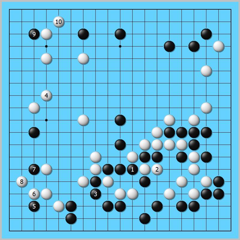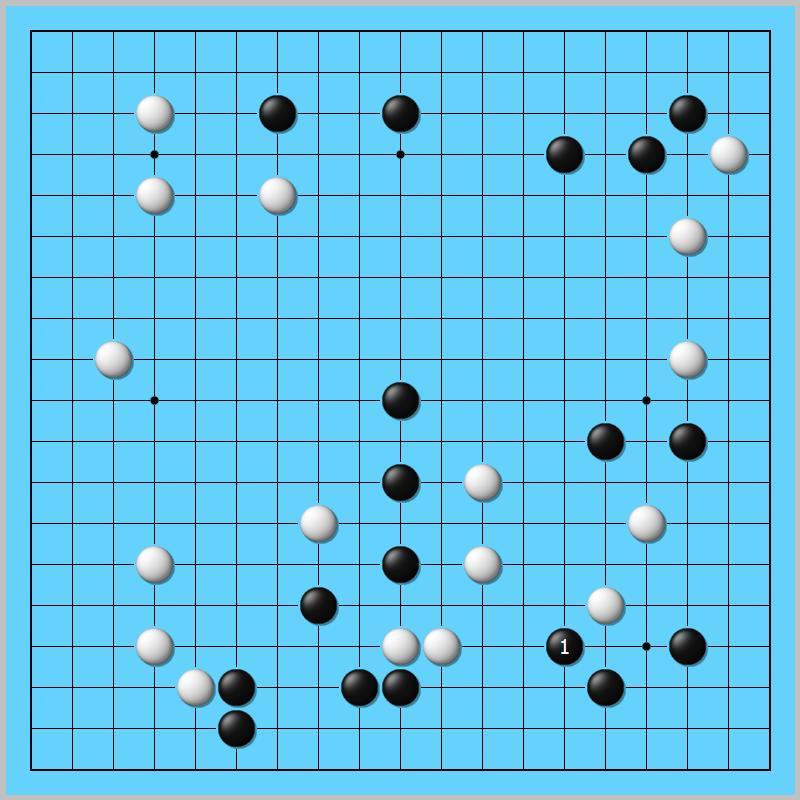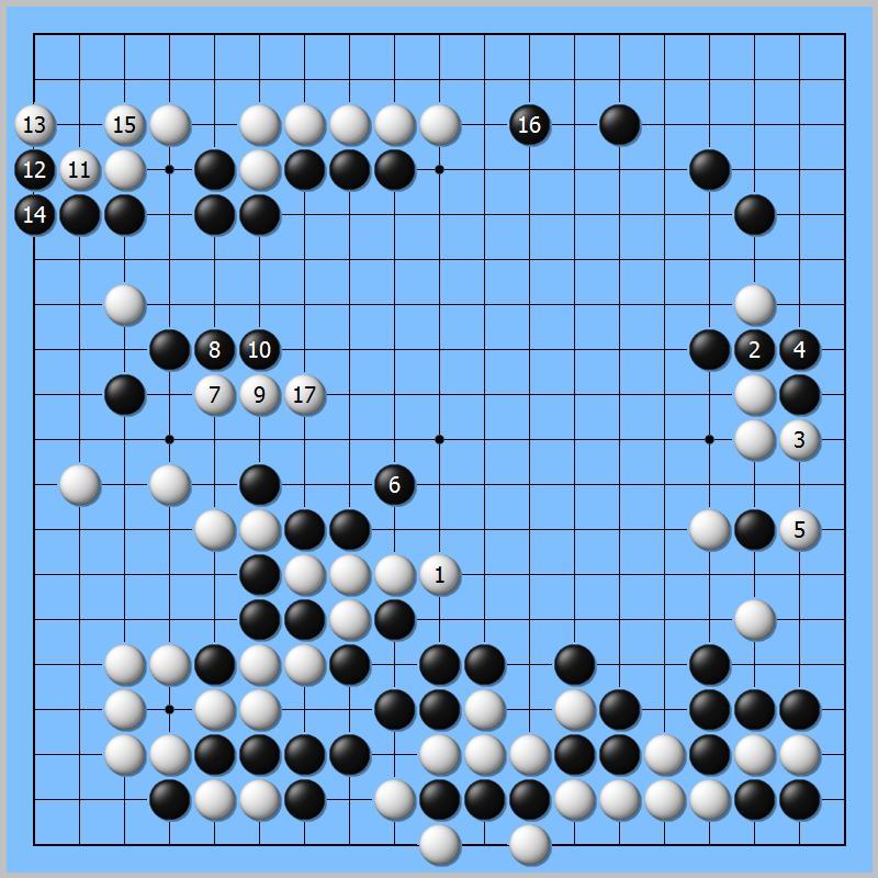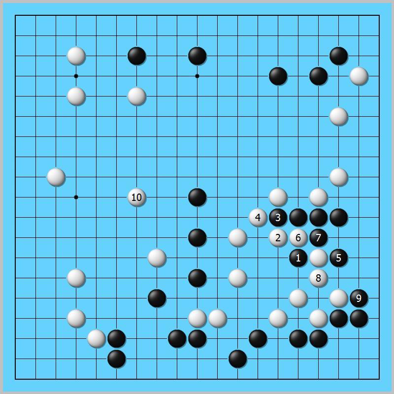 实战图九:黑棋打穿边路,但白棋走厚了中央,总体来说黑棋盘面不够了,