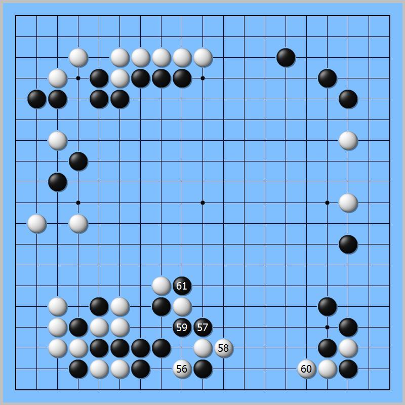 基本图局面:吴清源现在盘活下边一块棋。黑61断,吴清源如何应对?
