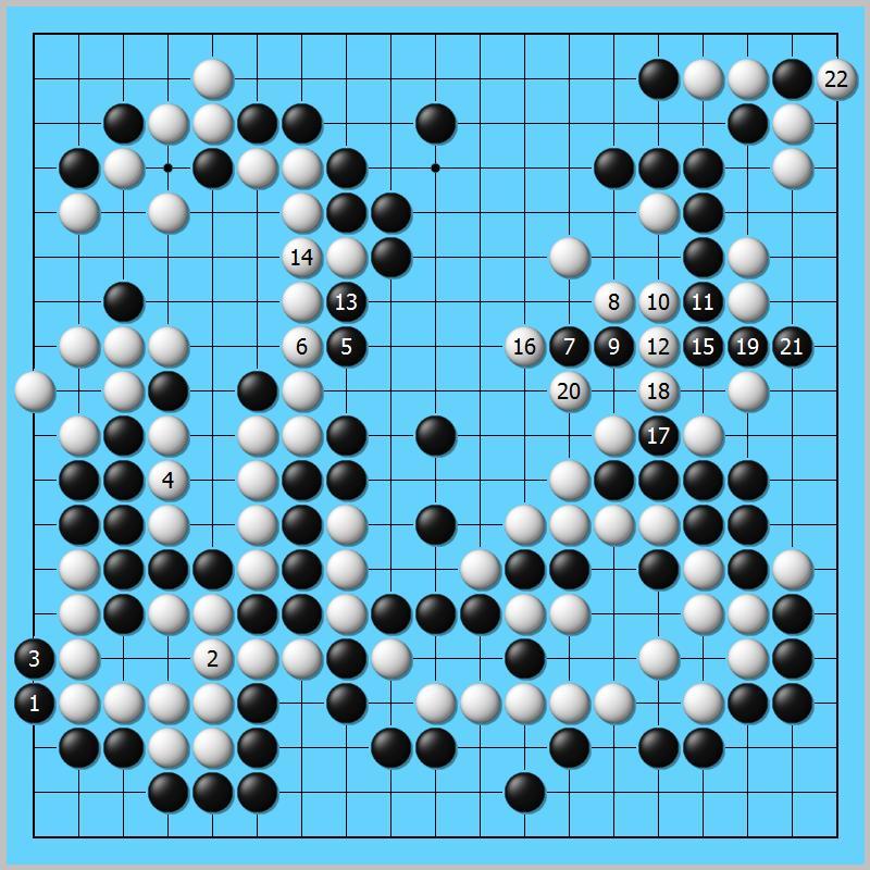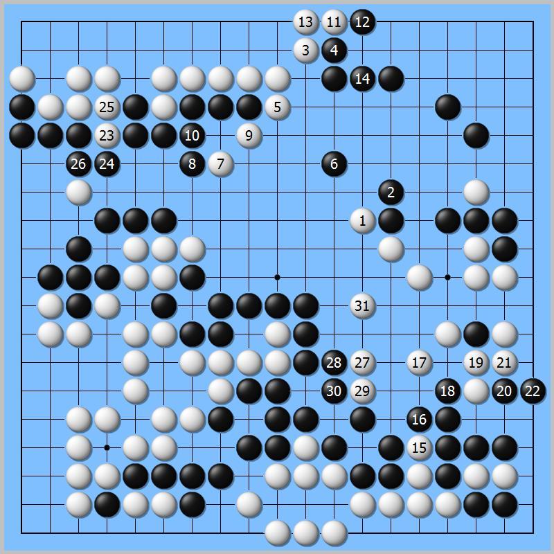 实战图一:白棋安定下来,然后白10趁机在左侧构筑势力。布局以后白棋下得生动有趣。