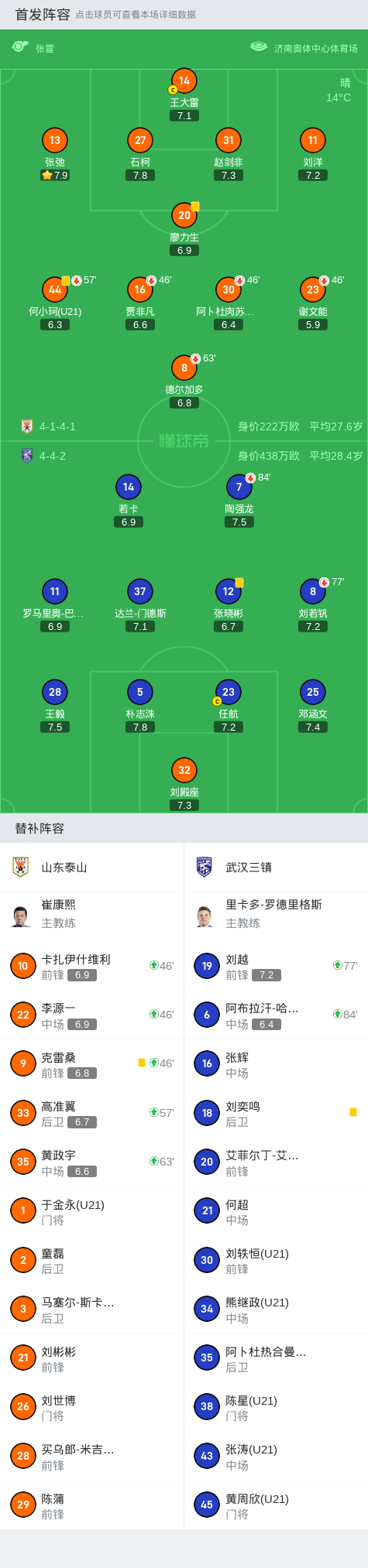 在中国足球顶级联赛第26轮的比赛中,山东泰山坐镇主场迎战武汉三镇。上半场德尔加多任意球造险,石柯头球顶偏,若卡远射擦柱而出,达兰破门被吹越位,下半场克雷桑远射打偏,若卡失良机。经过激烈的对抗,双方均未能攻破对方球门,比赛最终以0-0的比分收场。