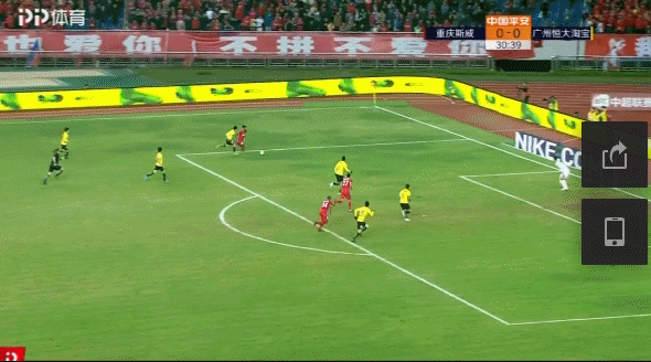 第31分钟,重庆扳平比分,冯劲前场左侧左突右晃连续过掉恒大三人防守突入禁区,面对刘殿座推射球门远角入网!1-1!↓