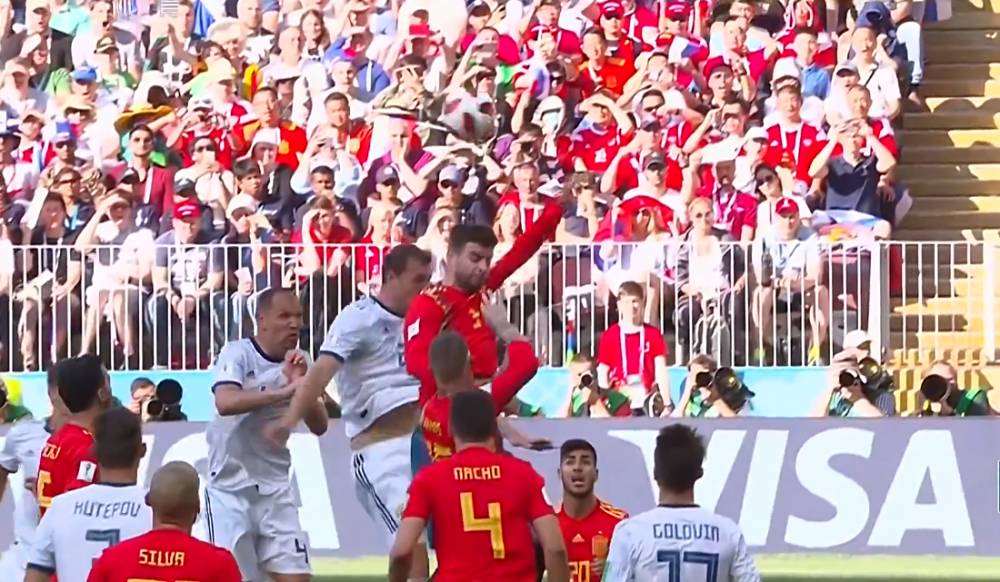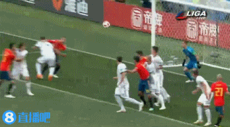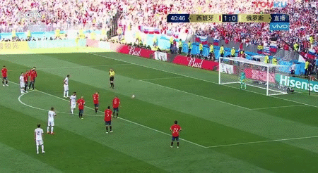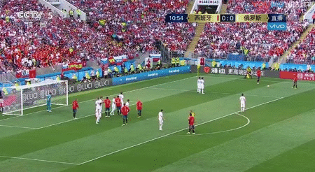 上半场好像开始,第3分钟,戈洛文下底传中被皮克挡出了底线。第7分钟,布斯克茨中场的长传也传大了。第10分钟,阿森西奥主罚任意球开出,伊格纳舍维奇和拉莫斯在门前纠缠拼抢,最后皮球打在伊格纳舍维奇的脚后跟上反弹入网,西班牙1-0俄罗斯!