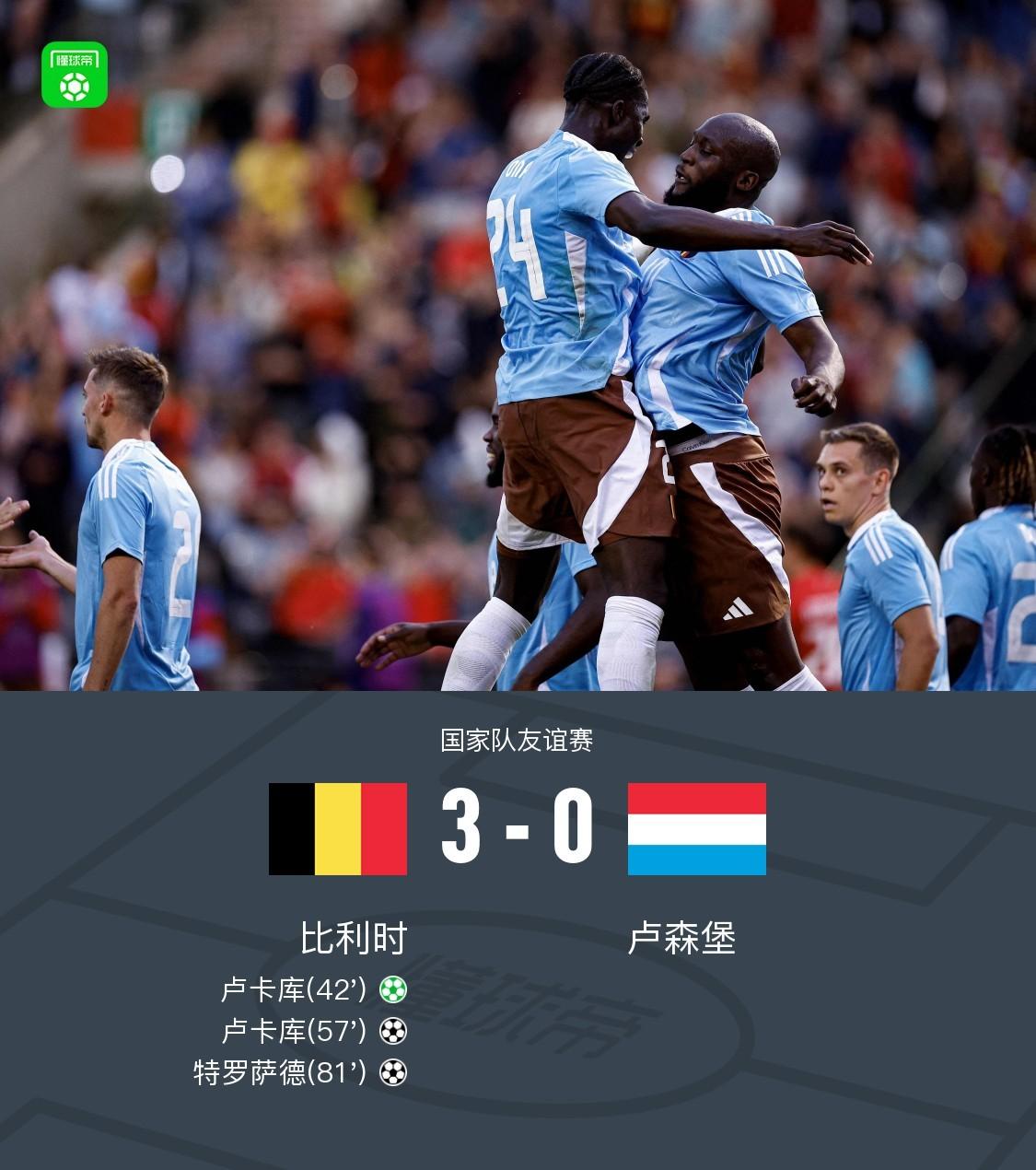 北京时间6月9日国家队友谊赛,比利时主场对阵卢森堡。上半场德布劳内精准直塞,卢卡库前插抽射命中边网,德克伊珀左路传中,队友两点包抄均未能打上,特罗萨德传卢卡库头球攻门高出,卢卡库突破造点,随后操刀点射命中打破场上僵局,下半场多库突破送出助攻,卢卡库后点轻松推射破门,若昂-巴卡约科调整劲射被扑,费斯后场长传给到特罗萨德,调整后凌空抽射破门锁定比分,全场战罢,最终比分比利时 3- 0 卢森堡。