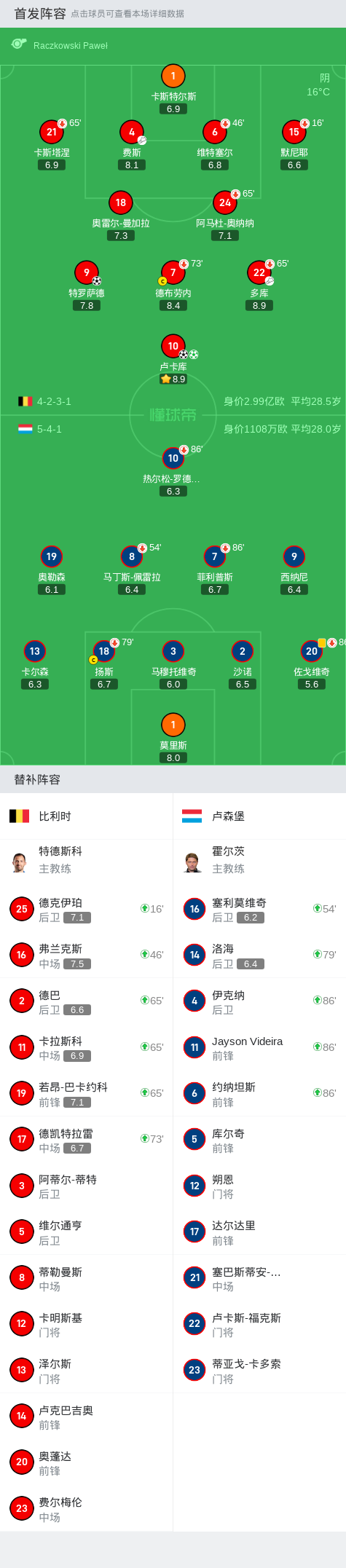 比利时首发及换人: