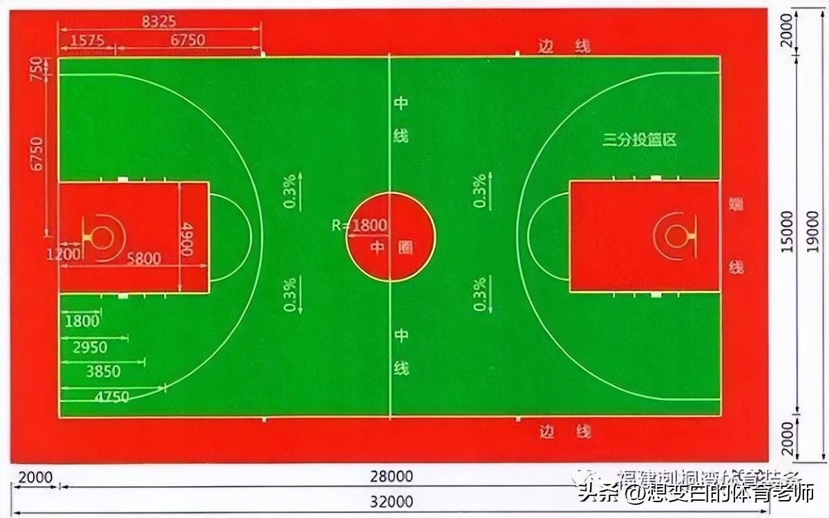 篮球比赛场长: 28米、宽: 15米、线条宽: 0.05米、中圈: 半径1.8米、三分线: 6.75米(2010年启用,之前为6.25米)、W罚球线: 从端线内沿到它的最外沿5.80米,长3.60米、三秒区: 4.90米×5.80米的矩形、合理冲撞区: 从篮圈落地中心点画一道1.25米半圆篮筐: 内缘直径最少为0.45米,最多为0.457米、篮筐高: 3.05米、篮板下沿离地高: 2.90米,国际篮联,奥运会篮球比赛和世界篮球锦标赛的比赛场地通用