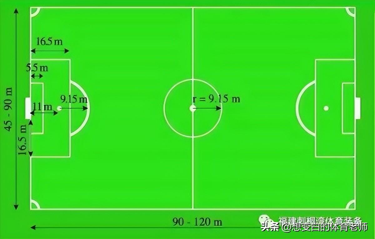 标准的11人制足球场:长度90~120米,宽度45~90米。