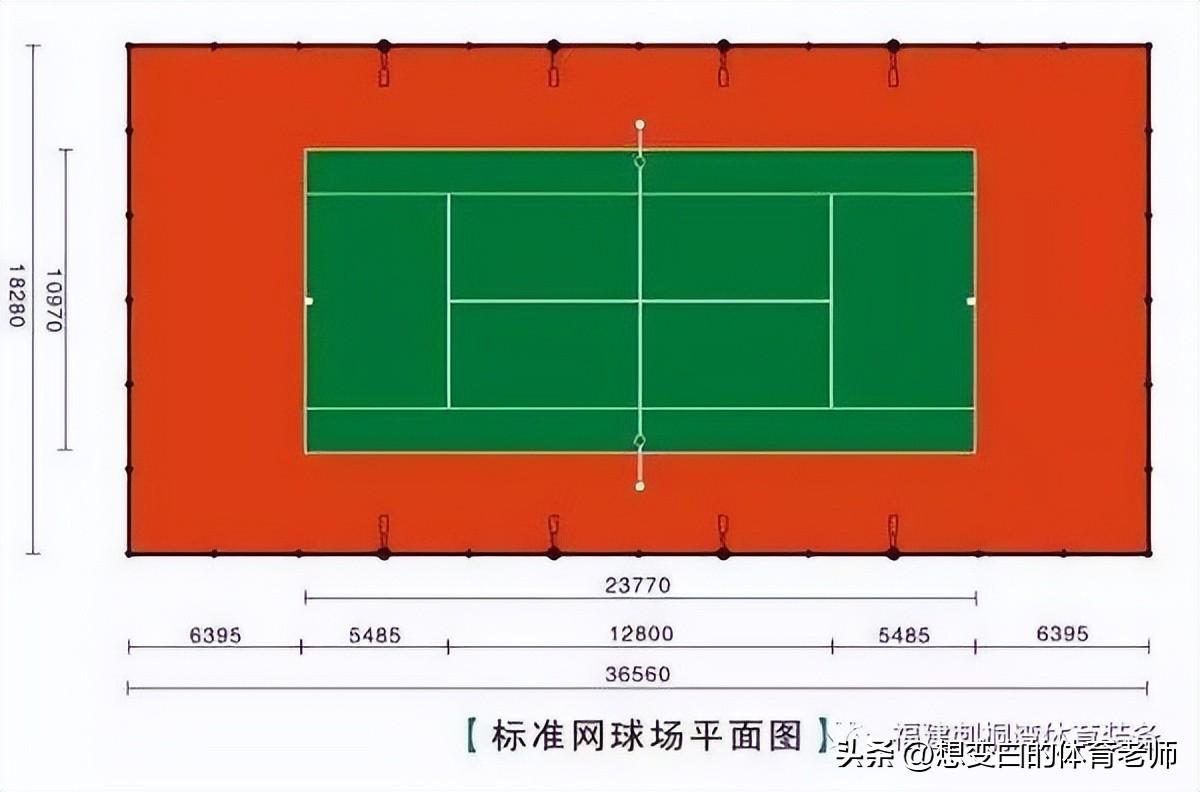 网球场整体呈一个长方形,标准尺寸是36560毫米(长)×18280毫米(宽),这个尺寸是网球场地整体标准。 其中比赛场地尺寸是23770毫米(长)×10970毫米(宽)。半场对角线长16170毫米。如果是两片或两片以上相连而建的并行网球场地。相邻场地边线之间的距离不小于4.0米。如果是室内网球场,端线6.40米以外的上空净高不小于6.40米,室内屋顶在球网上空的净高不低于11.50米。