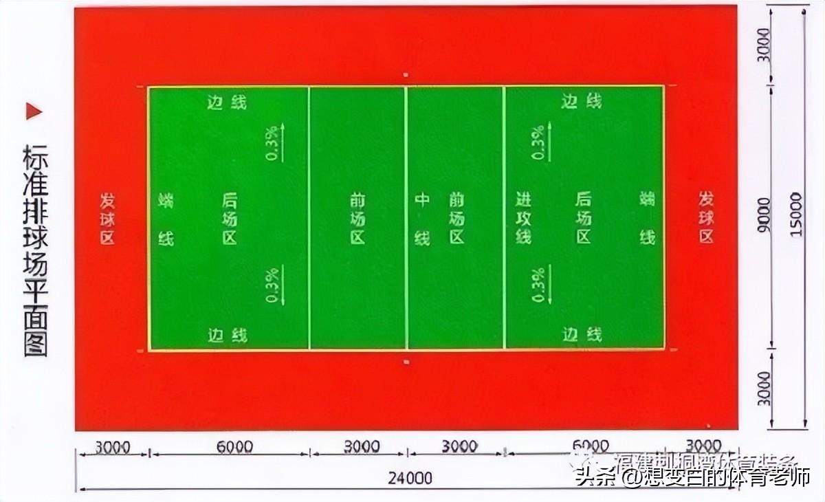 排球场为长方形,其长度为18米,宽度为9米。四周至少有3米宽的无障碍区。 从地面量起至少有7米的无障碍空间。国际排联世界性比赛场地边线外的无障碍区至少5米,端线外至少8米,比赛场地上空的无障碍空间至少12.5米。所有界限宽5厘米,其颜色与地面和其他项目的场地画线不同。长方形比赛场地的长边为边线,短边为端线。边线和端线的线宽均包括在比赛场地区的面积之内。