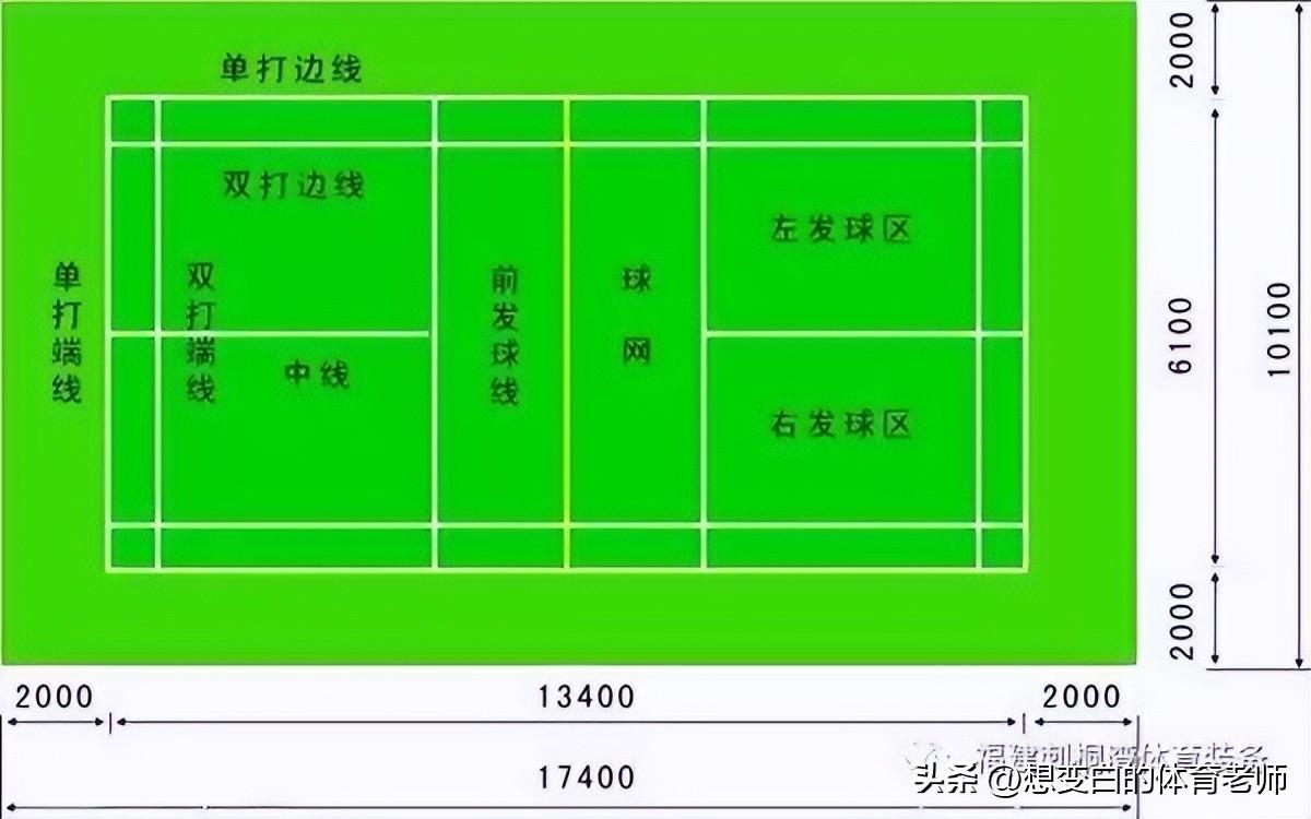 羽毛球场为长方形场地,长度为13.40米,双打场地宽为6.10米,单打场地宽为5.18米。 双打球场对角线长=14.723米,单打球场对角线长=14.366米。球场上各条线宽均为4厘米,丈量时要从线的外沿算起。球场界限最好用白色、黄色或其它易于识别的颜色画出。