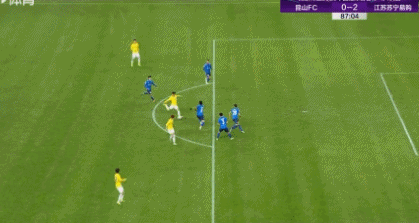 第87分钟,苏宁反击,高天意禁区前沿脚后跟将球磕给张凌峰,张凌峰迎球抽射,皮球越过昆山门将,击中立柱内侧入网,苏宁2-0锁定胜局。