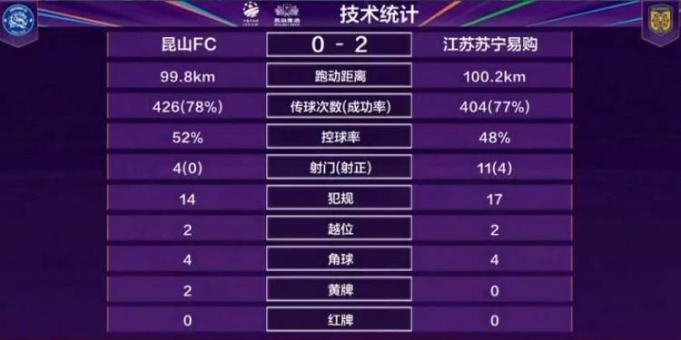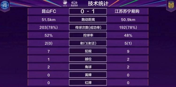 第46分钟,昆山的反击颇具威胁,突破后未能形成射门,但阮杨补射被苏宁后卫封堵,最后皮球被张岩没收。第50分钟,苏宁右路传中被解围,但皮球落到冯伯元面前,冯伯元的转身射门打高。