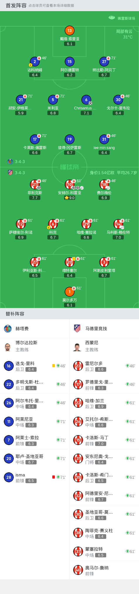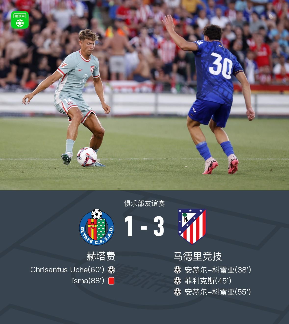 在一场激烈的俱乐部友谊赛中,赫塔费迎战马德里竞技。上半场,费尔梅伦助攻科雷亚低射破门,菲利克斯单刀建功扩大比分。下半场,略伦特助攻科雷亚推射破门,乌彻远射扳回一分,伊斯马染红,最终,马竞3-1赫塔费。
