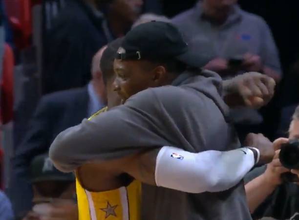 赛前,湖人球星詹姆斯在场边与热火时期的队友波什见面,二人在场边拥抱,相互致意。
