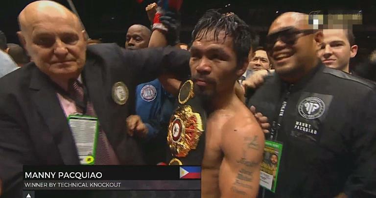 在第七回合,帕奎奥再次发力,后手拳再次击中了马特西,卫冕冠军第三次被击倒,这一次他的信心全无,没有继续比赛的欲望了,因为完全不是帕奎奥的对手。场上裁判肯尼-贝莱斯一看两人的实力相差悬殊,也就果断终止了这场一边倒的比赛。这样,比赛进行到第7回合2分43秒,帕奎奥TKO对手,挑战成功。值得一提的是,这是帕奎奥自2009年11月技术性击倒米格尔-库托之后,时隔近九年再次KO对手,帕奎奥等待这一刻,等了太久。帕奎奥这九年来,始终不能KO对手,一是状态有所下滑,一是打法偏于保守,另外就是对手的体格普遍比帕奎奥大。这次帕奎奥终于漂亮地KO了马特西,一战封神,重返巅峰。