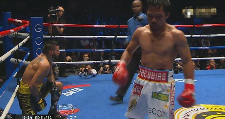 第五回合,马特西挨到了帕奎奥三记摆拳的进攻,尽管马特西曲臂防守,但也被一拳击中了太阳穴的位置,马特西再次倒地,好在铃声响起。此刻马特西其实已经是垂死挣扎了,被击倒两次,几乎不可能有获胜的希望。