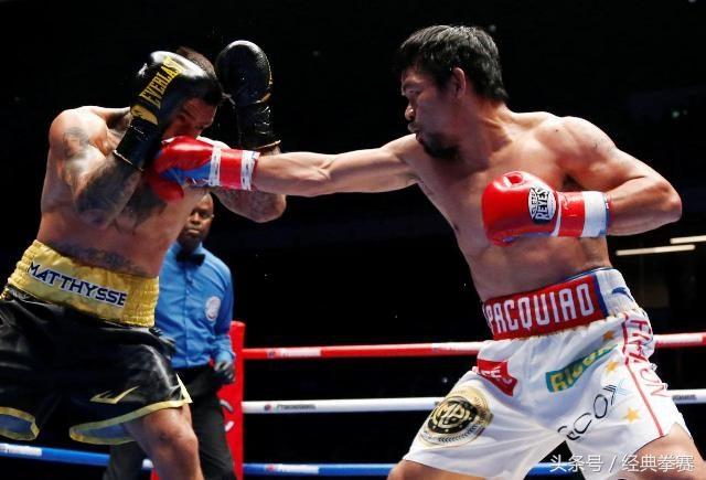 其实我们忽略掉最重要的一个问题就是,马特西和帕奎奥从根本上,就不是一个层次的拳手,巅峰时期的马特西也没有拿到过一条,四大拳击组织里的金腰带,而帕奎奥贵为八个级别的世界拳王,前无古人后无来者,拳击历史上第一人,虽然已过巅峰,但瘦死的骆驼比马大,技术尚存,这也是为何场面如此的一边倒,比赛中马特西也打出了很多重拳,但都被帕奎奥巧妙的移动化解,每次出后手拳都被狠狠的迎击,有力无处使,这就是技术。