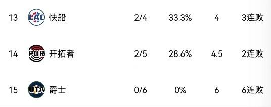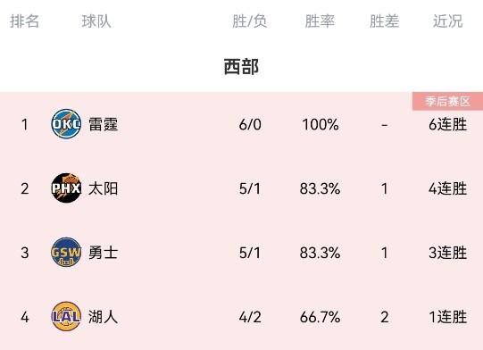 目前,太阳5胜1负西部第二,勇士5胜1负西部第三,湖人4胜2负西部第四,快船2胜4负西部倒数第三。