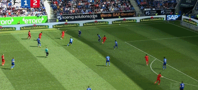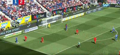 第23分钟,霍芬海姆定位球机会,队友传中,拜尔在后点险些够到皮球
