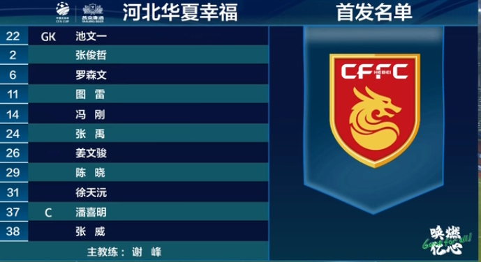 河北华夏幸福首发阵容:22-池文一;2-张俊哲、26-姜文骏、29-陈晓、37-潘喜明、6-罗森文、14-冯刚、24-张禹(U23)、31-徐天沅(U23)、11-图雷、38-张威(U23)