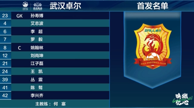 武汉卓尔首发阵容:23-孙寿博;4-艾志波、6-李超、7-罗毅、12-刘尚坤、42-李兴齐(U23)、8-姚翰林、21-江子磊(U23)、24-王凯、39-丛震(U23)、41-陈骜(U23)
