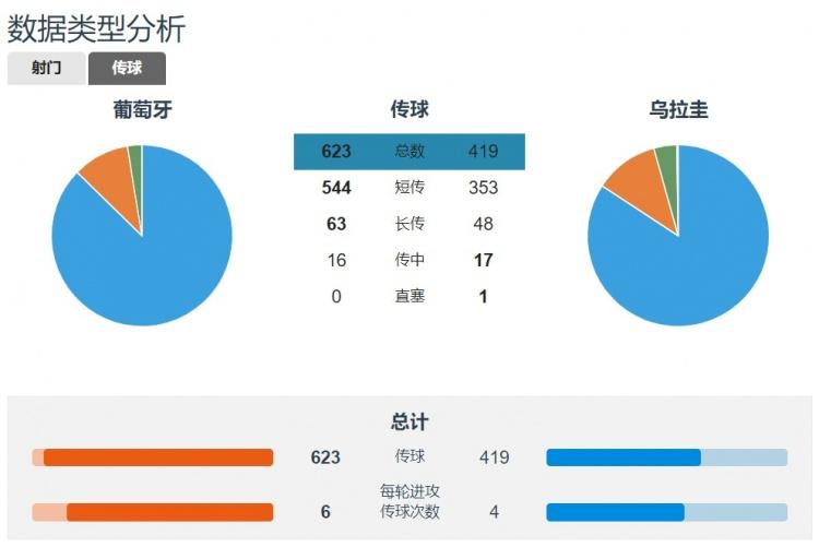 老帅桑托斯仍然以控制打法为主,在前场堆积技术型中场,通过传导将进攻持续渗透到乌拉圭核心区域。葡萄牙队的传球数据远远领先于对手,就能看出他们在比赛中的主导地位。同时,葡萄牙队在组织进攻时也非常有耐心,一旦没有渗透空间就会回传重新组织,或者将球权转移到弱侧,因此整体失误率很低,乌拉圭上抢效果也不理想。