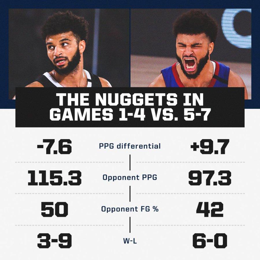 而在G5-G7的比赛中,掘金战绩为6胜0负,场均净胜9.7分,限制对手得到97.3分,命中率42%。