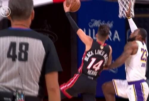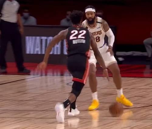下半场,热火变本加厉收缩,战略性放空三分线外的铁林,铁林的防守人参与夹击詹眉,限制詹眉处理球,尤其以三人合围浓眉化解其持球单打,逼迫湖人其他人终结进攻,湖人一度7投0中、三分球4中0,热火通过巴特勒先后与邓罗、希罗在霍华德一侧掩护手递手二人转抢投三分轰出10-0攻击波。