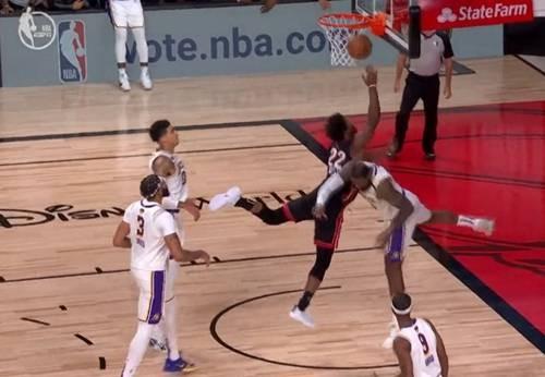 湖人因霍华德在场采用保守的防挡拆和防无球策略,后卫群绕过掩护重点围追邓罗、希罗;进攻端利用霍华德的绝对高度轰炸禁区,勒布朗转换冲阵勇往直前,湖人以内线优势为突破口,但因浓眉遭遇绕前和夹击防守导致阵地战攻坚受阻,湖人团队转移球阻滞,连续失误开局慢热。