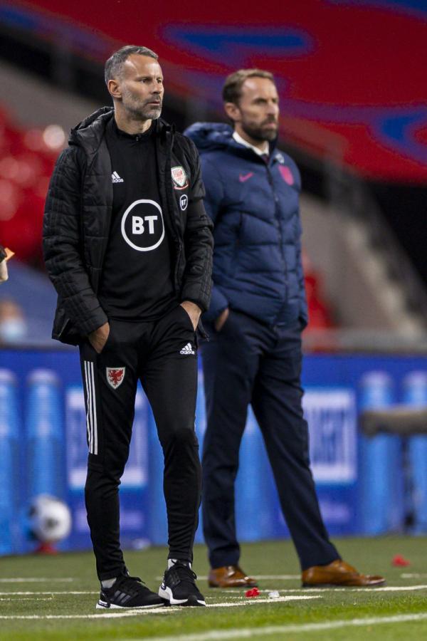 ↑10月8日,威尔士队主教练吉格斯(左)与英格兰队主教练索斯盖特在比赛中。