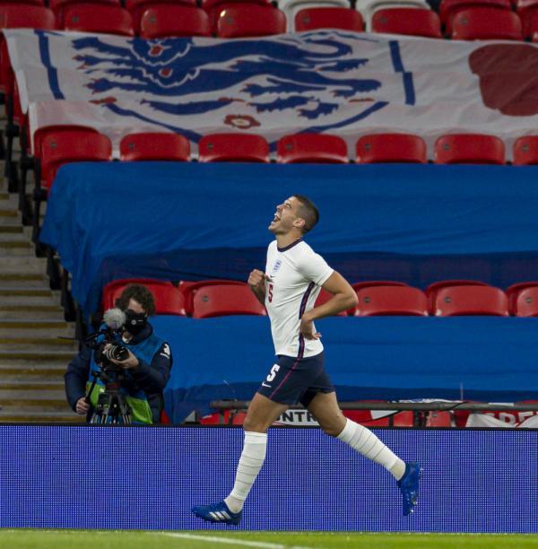↑10月8日,英格兰队球员科迪在进球后庆祝。