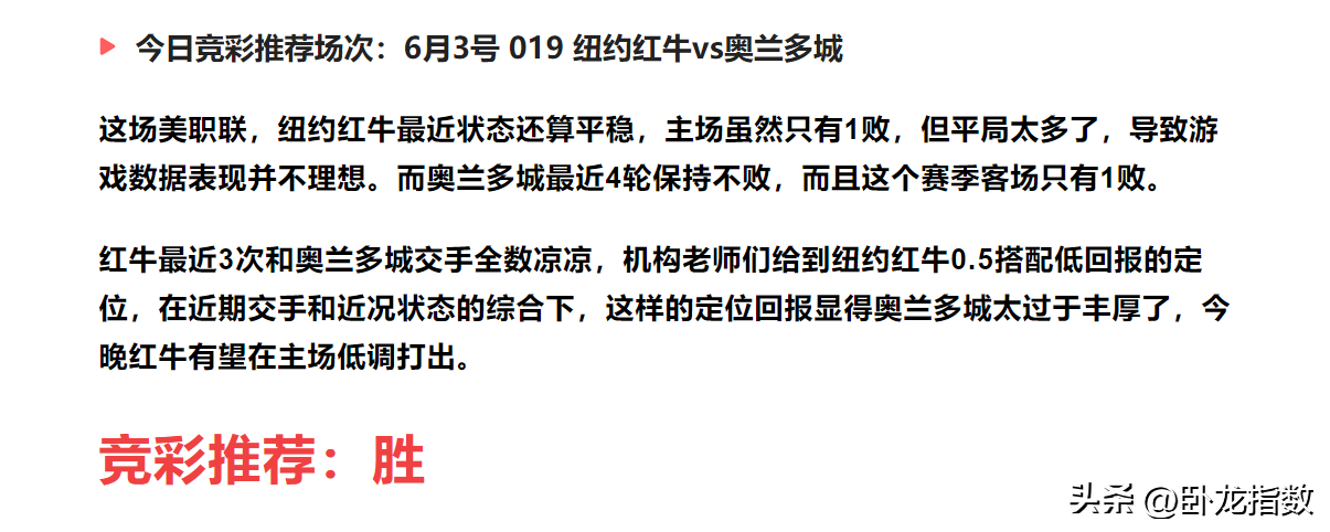 今日竞彩推荐场次:6月3号 019 纽约红牛vs奥兰多城