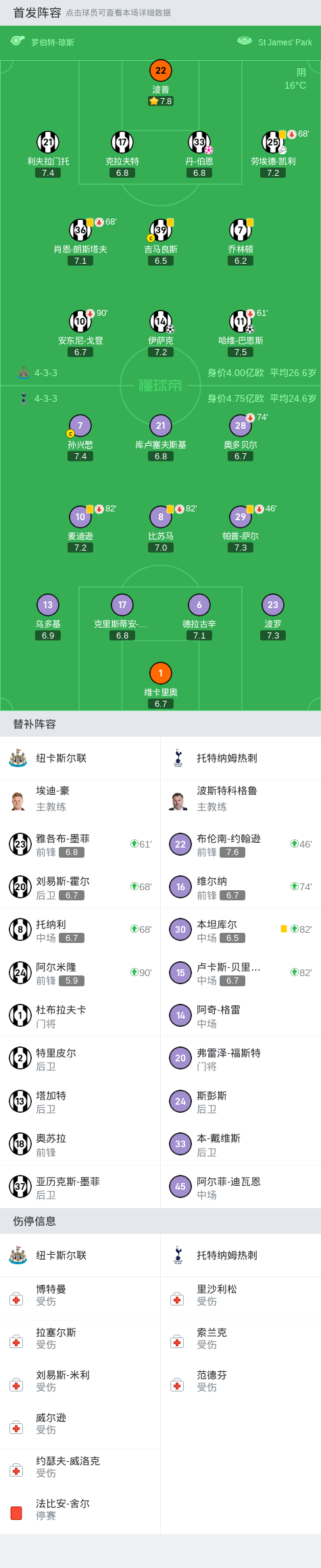 北京时间9月1日晚间20:30,英超联赛第3轮,纽卡斯尔联坐镇主场圣詹姆斯公园球场,迎战托特纳姆热刺,本场比赛主裁判为罗伯特-琼斯。上半场,伊萨克吊射击中横梁,边裁出现伤情,随后被第四官员替换,萨尔远射造险,哈维-巴恩斯打破僵局。下半场,奥多贝尔错失良机,布伦南-约翰逊造成丹-伯恩自摆乌龙,解禁复出的托纳利替补登场,墨菲助攻伊萨克,打进制胜球。最终,纽卡斯尔联2-1战胜托特纳姆热刺,取得了这场比赛的胜利。