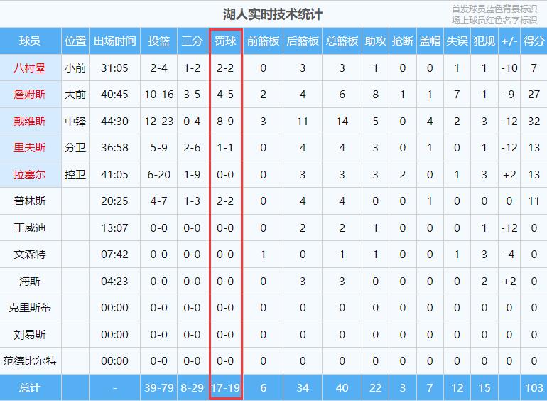 本场比赛,湖人全场获得19个罚球,罚进17个,掘金全场获得6个罚球,罚进5个。
