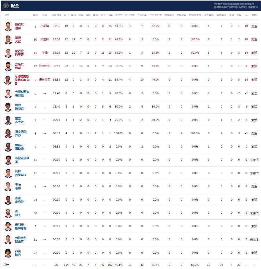 丹佛掘金约基奇32分12板7助2断,贾马尔-穆雷22分6板10助1帽,小波特19分8板1断2帽;