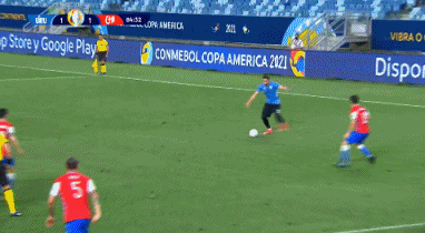 第44分钟,弧顶处桑切斯斜塞,尼古拉斯-迪亚斯肋部扫送,乌拉圭抢先解围。