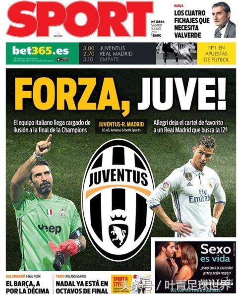 《每日体育报》的头版头条是“FORZA JUVE”,醒目的尤文队徽,公开为尤文图斯加油助威,虽然这是一家加泰罗尼亚地区的报纸,但也是属于西班牙,却如此“偏向”一支外国球队,还是淘汰过自己的球队。